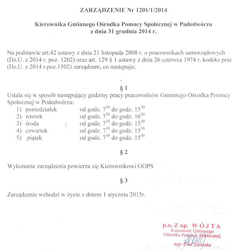 Godziny pracy pracowników Gminnego Ośrodka Pomocy Społecznej w Podedwórzu