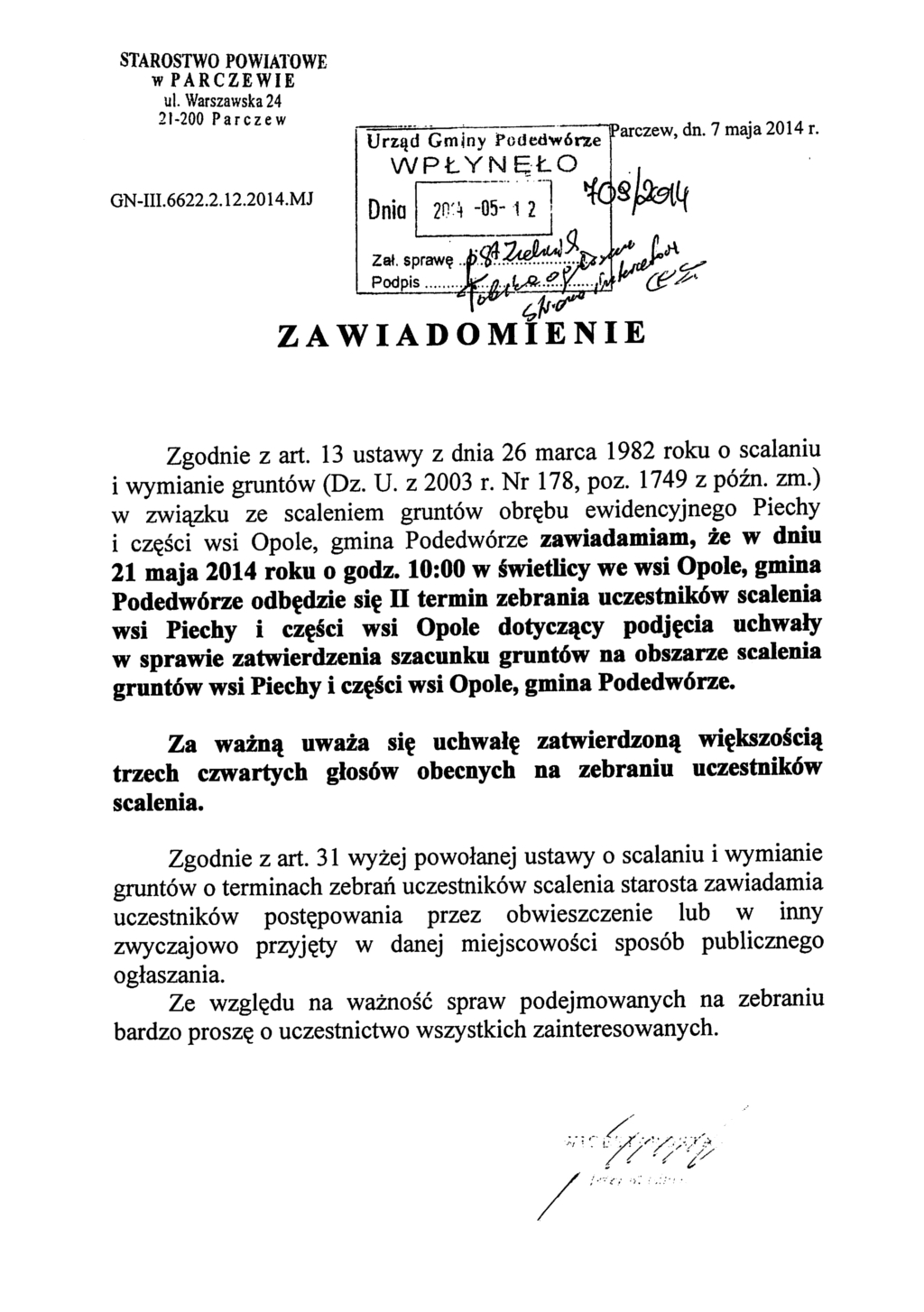 II termin zebrania uczestników scalenia wsi Piechy i części wsi Opole