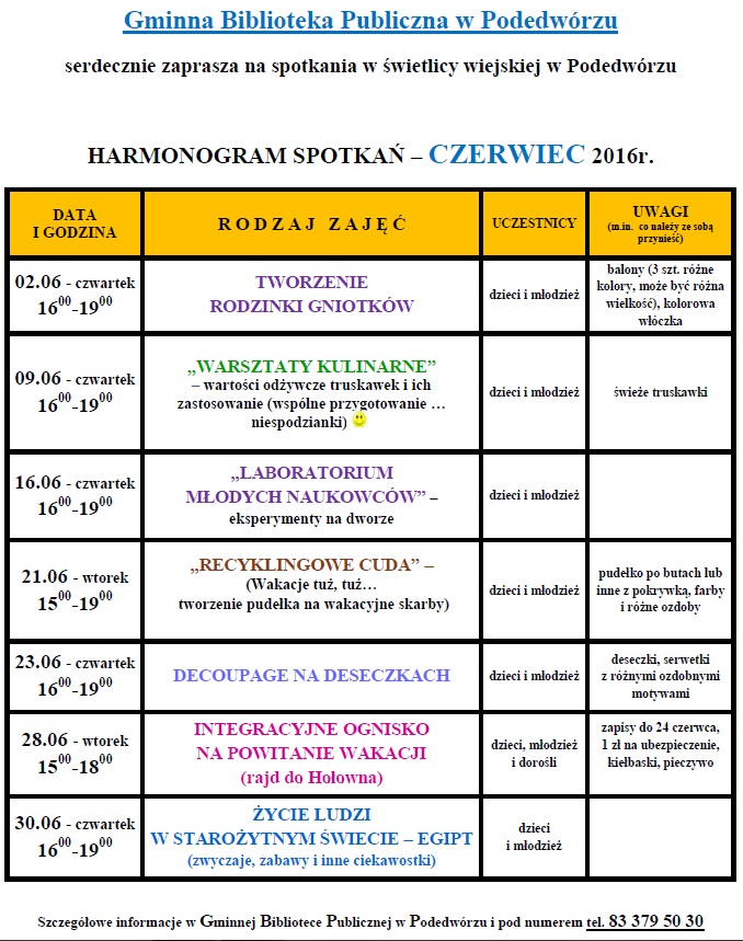 Gminna Biblioteka Publiczna w Podedwórzu serdecznie zaprasza na spotkania w świetlicy wiejskiej w Podedwórzu HARMONOGRAM SPOTKAŃ - CZERWIEC 2016r.